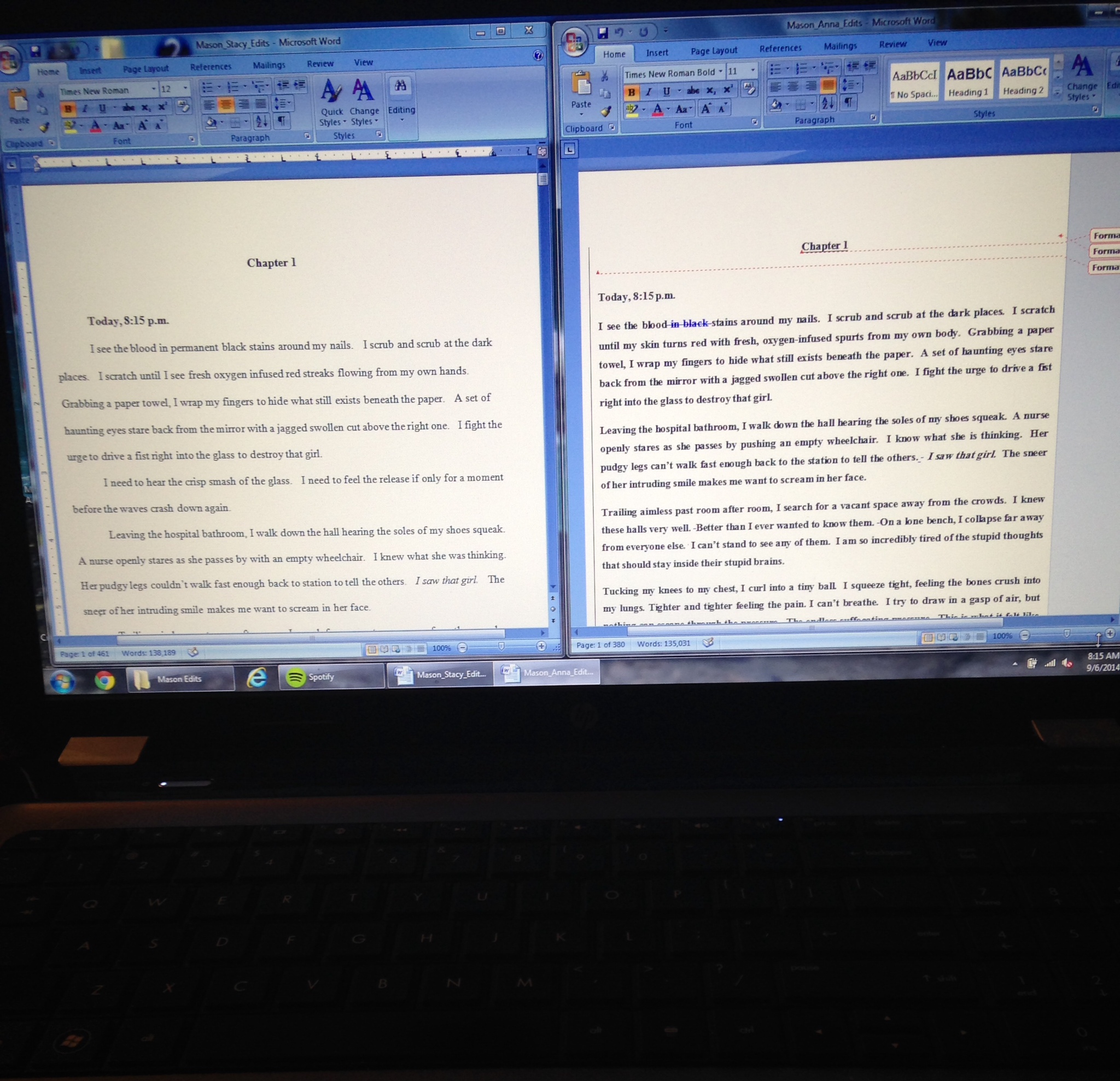 For me, this is the most tedious part of writing a novel. Line by line. Word by word comparison of the two copies. This story is approximately 137,000 words which is roughly 550 novel pages. In Microsoft Word, my copy is 461 pages.